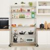 The shelf comes with adjustable feet and mobile wheels, the adjustable feet improve balance and with the wheels on you can easily move it anywhere.